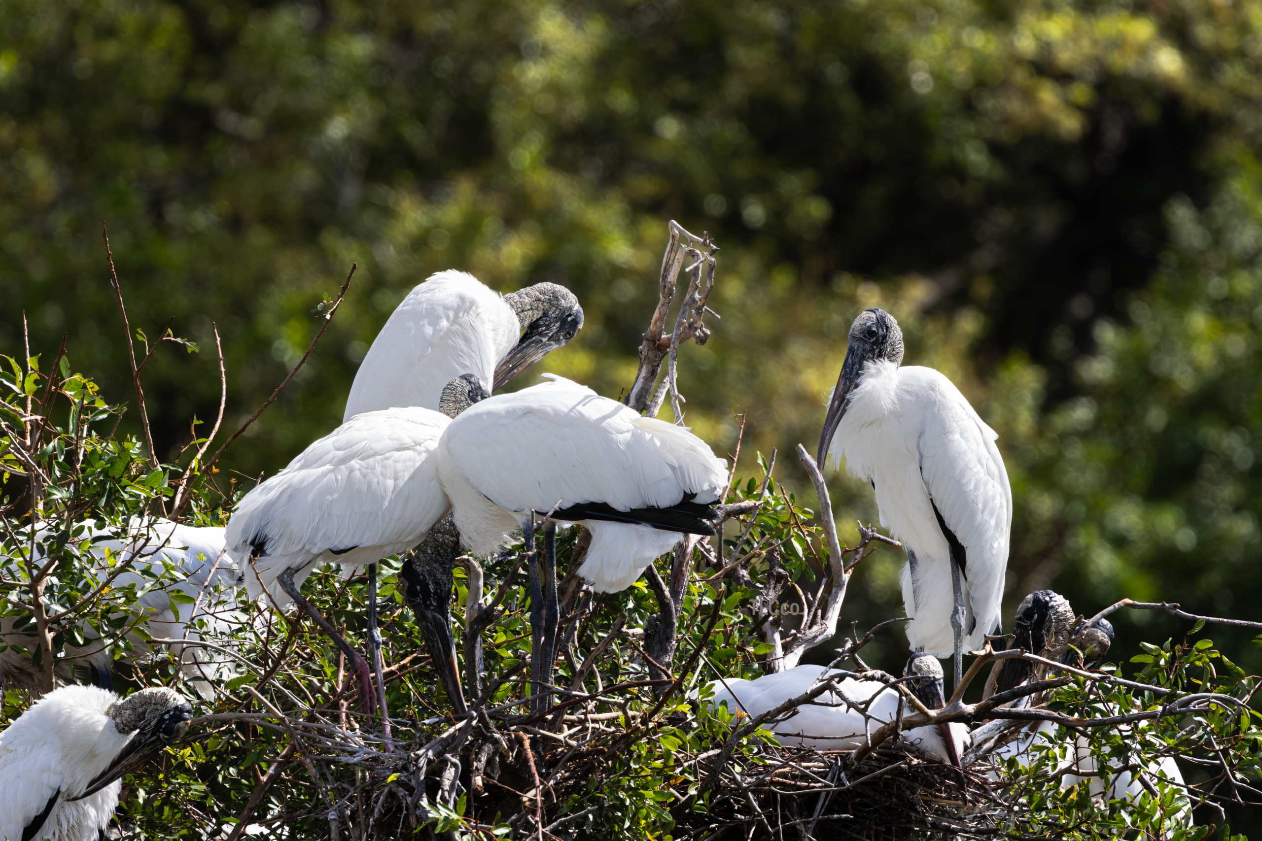 Wood storks dominate the colony at Tampa Bay Harley Davidson but share their space with other species. Photo by Silo Garcia