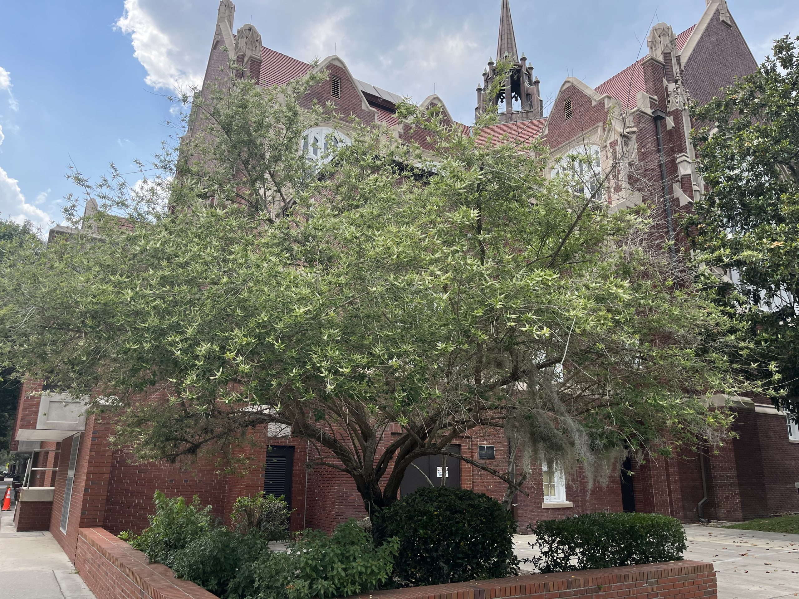 Two native plums (Prunus spp.) are commonly used as small trees in Florida yards, Chickasaw and Flatwoods. They both have spectacular white flowers in the early spring, followed by fruit, which probably won’t live up to grocery store standards but is much beloved by many birds and small mammals. Flatwood plums have thorns; Chickasaws don’t, which makes them a better choice for small yards where children and animals may play. Both prefer full sun and can reach 15 to 20 feet tall.