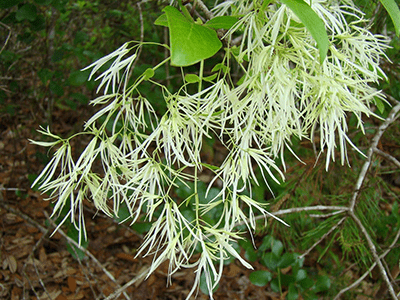 White fringe tree (Chionanthus virginicus) is a native that grows to about 20 feet tall. Like many spring bloomers, it’s easy to miss in a landscape until its show-stopping flowers appear in the spring. They’re ideal for planting in urban areas because they adapt to most soil types (except in salty areas). Both males and females have flowers, but the female trees will produce olive-like fruit that are favored by birds, although not edible for humans.