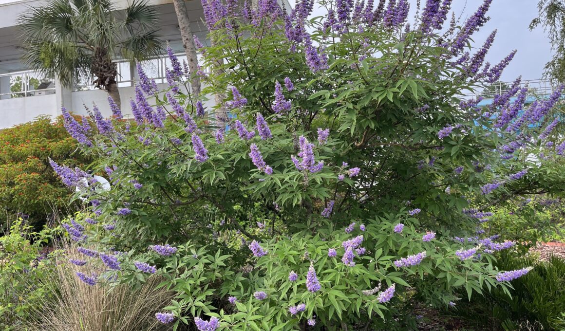 Chastet Tree, (Vitex agnus-castus) is another plant that can be grown either as a small tree or a large shrub. It’s another show-stopper in the spring, when 10-inch spikes of purple flowers show up. It blooms intermittently all summer long, although you’ll get many more blooms if you cut the flowers back as they die. In my Brandon landscape, we call it the entertainment center because it attracts so many bees and butterflies, including threatened native bees.