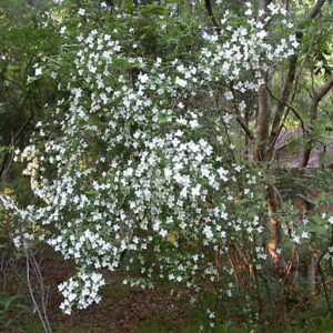 Scentless mock orange or English dogwood (Philadelphus inodurus), is a Florida native, although its range extends much further north. It’s a true harbinger of spring, with large white flowers that attract bees and butterflies. Despite its common names, it’s not related to either oranges or dogwood. Although the flowers do resemble dogwood, the orange moniker is confusing since the flowers are much larger than citrus blooms – and it does have a pleasant scent, although not as strong as citrus. Mock orange can be grown as a small tree – up to 10 feet tall — or a multi-stemmed shrub. Unlike many flowering trees, it blooms profusely even in shady locations, where its branches may take on an attractive weeping habit.
