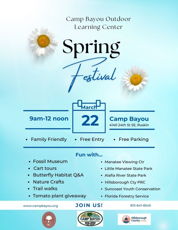 Joining the Camp Bayou Nature Center for a morning of fun is the Paleo Preserve Fossil Museum, Manatee Viewing Center, Suncoast Youth Conservation Center, Hillsborough County Parks, Rec and Conservation, Little Manatee River State Park, Alafia River State Park and Florida Forestry Service.