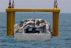 The underwater segments were assembled on a 1,000-foot- barge that covered about three or four miles per day. Pipe sections, each 40-feet-long and weighing 15 tons, were delivered to the barge twice daily. The concrete-coated sections were welded together, then tested with xray and ultrasound to ensure there were no leaks before they were lowered to the sea floor as much as 800 feet below the barge. Before the barge moved across Tampa Bay, divers physically relocated all soft and hard coral formations weighing less than 20 pounds from the path of the pipeline. On the surface, two spotters watched for wildlife, especially manatees and turtles. Work was halted on multiple occasions to ensure that these endangered species weren't troubled. Additionally, more than $500,000 was spent on a monitoring initiative that tested water quality before and after the barge moved through, although a zero discharge policy meant that nothing went overboard, even excess rainfall. To mitigate for damage caused by the pipeline, more than 111,250 separate structures will be deployed across 57.4 acres of underwater habitat, including 110,000 limestone boulders and 250 reef modules. The boulders are three feet in diameter and each weigh about a ton. The deep-water reef modules are made of limestone in a concrete matrix with an internal cavity and very rough surface. They were placed in areas that the Florida Department of Environmental Protection, the Florida Marine Research Institute and the National Marine Fisheries Service determined would have the greatest positive impact. The modules provide some ecological benefits that can't be duplicated by the boulders. However, the natural boulders most closely resemble the hard bottom already on the sea floor.