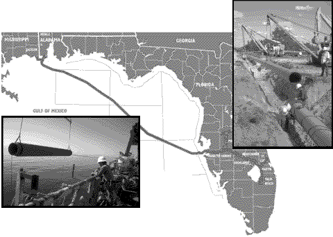 Building Florida's First Offshore PipelineA new natural gas line stretching from South Alabama across the Gulf of Mexico, through Tampa Bay and over to Polk County is a technological wonder. Florida's first offshore pipeline, it can transport about 1.1 billion cubic feet of clean-burning natural gas every day - enough to create electricity for 4.5 million homes. More than 580 miles long - including 431 miles underwater - it took 2,500 workers almost a year to install 450,000 tons of pipe.