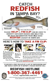 Tampa Bay anglers are being enlisted to help assess the impacts of hatchery-raised fish released into the wild by taking a nickel-size clip from the dorsal fin of any redfish they hook, packing it on ice, and returning the clip to a participating bait and tackle shop.