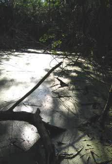 A muck-covered pond awaits an extreme makeover as part of a restoration project that will turn stagnant pools into a chain of thriving wetlands. The abandoned ponds are remnants of a tropical fish farm. |