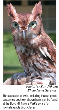 Boyd Hill Nature Park provides additional opportunities for studying owls, such as the newly constructed non-releasable bird of prey aviary that, among other raptors, includes three species of owls. These birds are permanently crippled due to inflictions (many senseless) caused by humans, such as gunshot, exposure to poisons, and encounters with automobiles, high wires, towers and windows. Dedicated volunteers maintain these birds so that they may serve as ambassadors for those that still fly free in the wild.