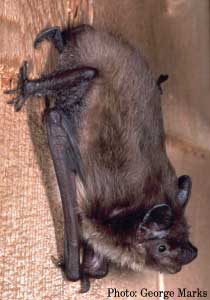 Evening bats have a relatively short life span of about 10 years, compared with other bats that may live as long as 30 years. Mating typically occurs in the fall, and one to two pups are born between mid-May and early June. The newborns are pinkish and naked, with a few scattered hairs. By day five the skin darkens and fur begins to grow. They can fly on their own by three weeks. |