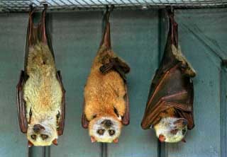 Three Golden Manteled fruit bats hang out in an enclosure at the Lubee Foundation near Gainesville, FL