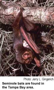 Other common bats are the yellow, Seminole and the eastern pipistrelle. Yellow bats hang out in dead palm fronds and Spanish moss; the pipistrelle uses a variety of roosts.