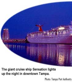 One of about 40 licensed bay pilots assigned to Tampa Bay, Timmel and other specially trained navigators board incoming ships a mile out to sea and outgoing vessels at port, guiding them through the bay's narrow channels. Bay pilots carry portable navigation units that use electronic charts and differential GPS (sophisticated satellite positioning technology) to pinpoint vessel locations within two to three feet, tracking changes within seconds. Navigating these floating behemoths in tight quarters requires skill and in-depth knowledge of local conditions. Some of the largest ships entering Tampa Bay are longer than 950 feet, twice as long as Tampa's tallest skyscraper. The giant cruise ship Sensation is 855 feet, just shy of the length of three football fields. As many as a dozen ships arrive or depart on any given night. Cruise ships generally take two hours to navigate the channel, and there are no bail-out or passing zones. Shipping lanes are dredged to depths of up to 43 feet, and narrow to 200 feet in some places. Stopping mid-course isn't a practical option: bringing a deep-loaded tanker to a halt can take a mile or more from an average speed of just 12 knots (about 14 mph). That makes thinking ahead critical. But traffic is generally light and the views are spectacular. "We forget how many stars are out at night," says Timmel, "and then we get away from shore and the sky suddenly fills up." Visitors also are enthralled. Bay pilots are ambassadors of sorts, greeting crews from all over the world. "A lot of times you'll be the first person they've seen in weeks and their first impression of what Americans are truly like. We bring them a newspaper·we bring them into the bay, and you can feel a sense of excitement the closer you get to port." "It's almost like you're entering Oz." |